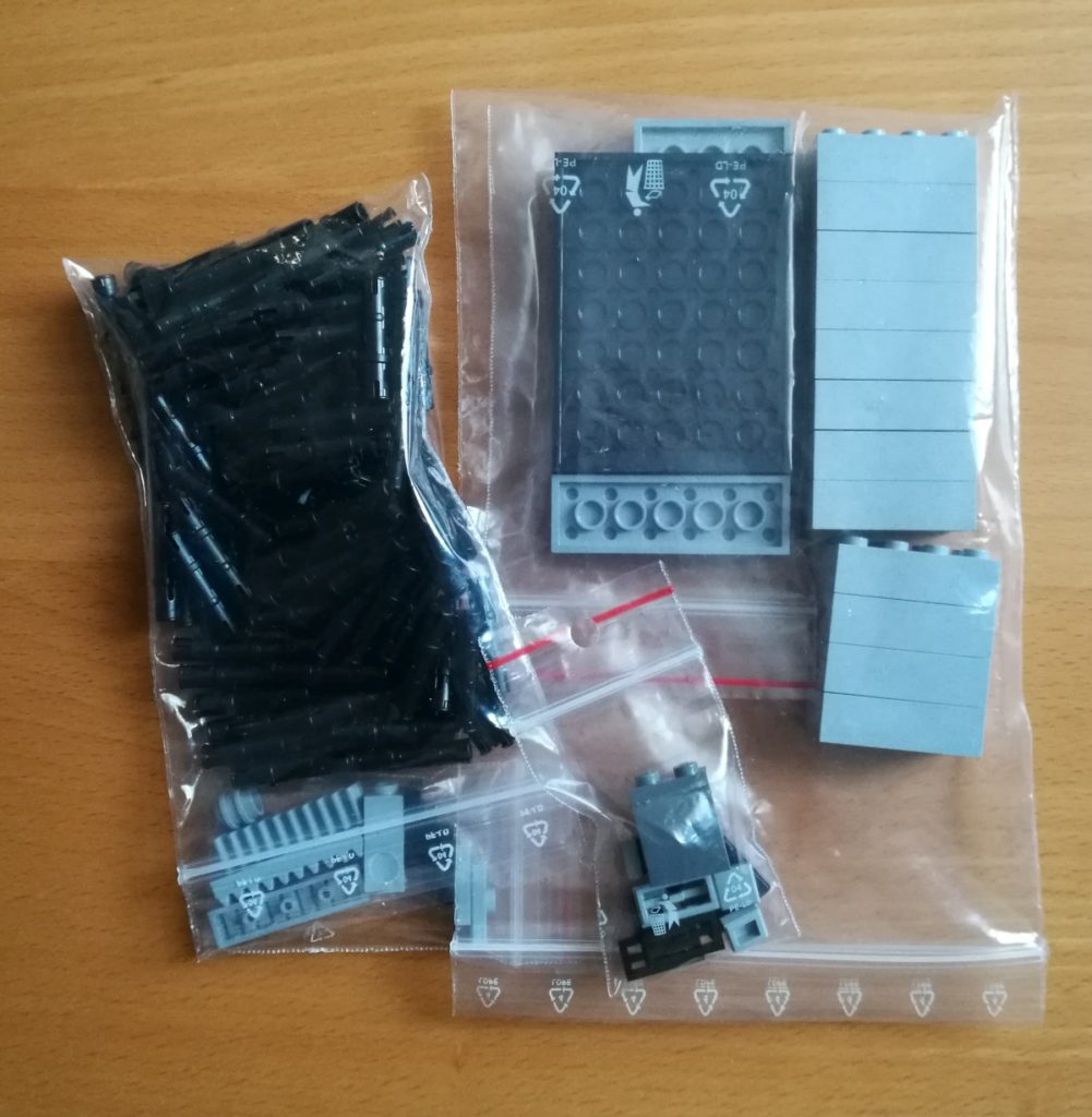 Tym razem padło na długie bolce Technic, których potrzebowałem 111 sztuk. Co prawda teoretycznie mogłem nieco przyoszczędzić na kolorze – kupując zamiast czarnych np. niebieskie (zasadniczo i tak będą niewidoczne w konstrukcji), ale ostatecznie zdecydowałem się na kolor oryginalny, więc nie zaoszczędziłem jakichś 15 złotych.