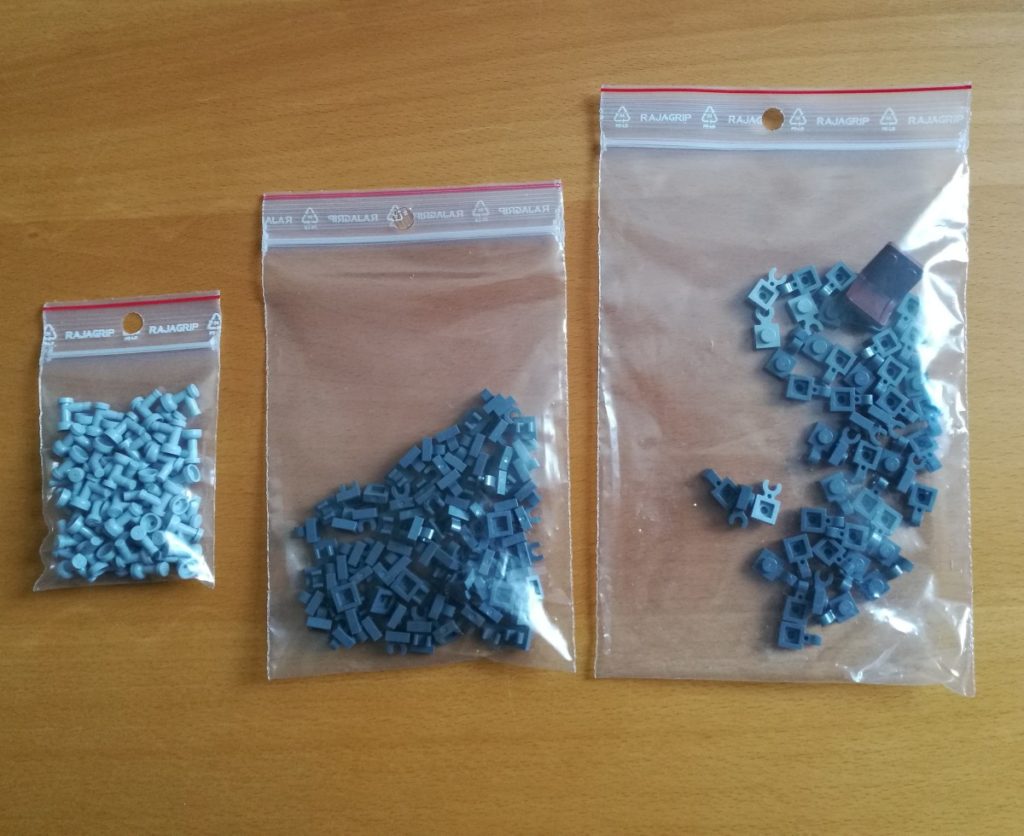 Kompletowanie tego zamówienia było problematyczne – gość (znowu Holender) miał praktycznie wszystko, co mi było potrzebne do zakończenia budowy, ale zapłaciłbym za całość ponad 1200 euro, przy cenach 2-3 razy wyższych od rynkowych. Moje 88 elementów składało się na ledwie kilka euro, a oczywiście nie było sensu robić tak drobnego zamówienia, bo przesyłka byłaby droższa od towaru. Tak więc dobrałem inne klocki, aby dobić do 25 euro. Dzięki temu zdobyłem dwa kolejne liczne elementy: „kranik” – 56 szt. oraz „poziome szczypce” – 42 szt. plus masę drobnicy, w tym fotel pilota.